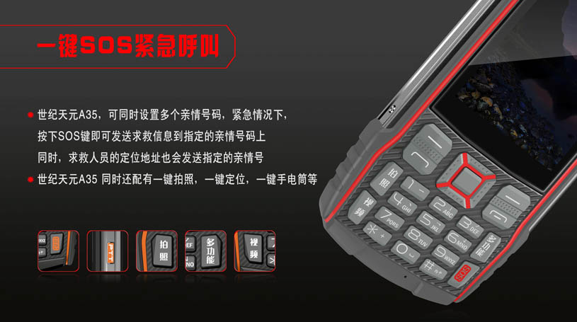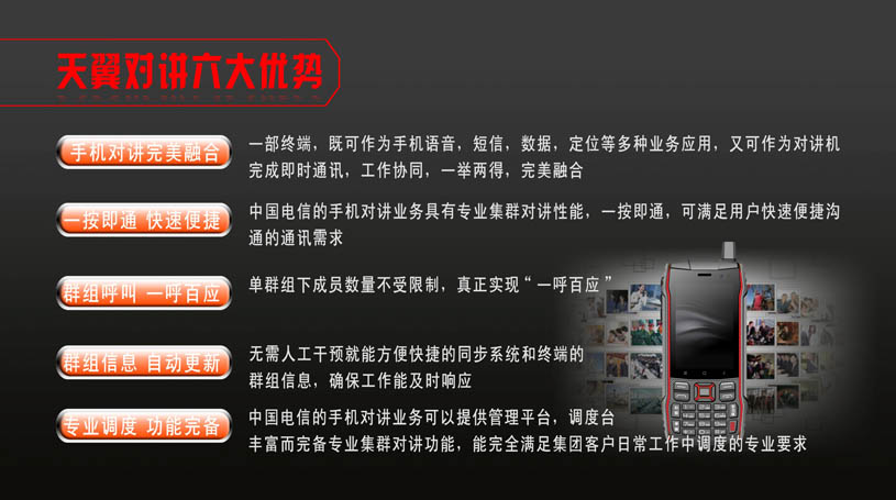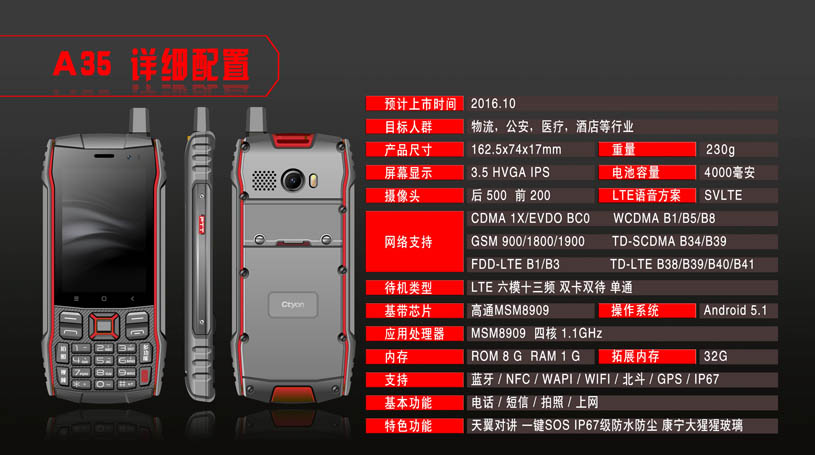 產(chǎn)品特點:天翼對講(CTChat)、一鍵SOS、智能三防、防水防塵
